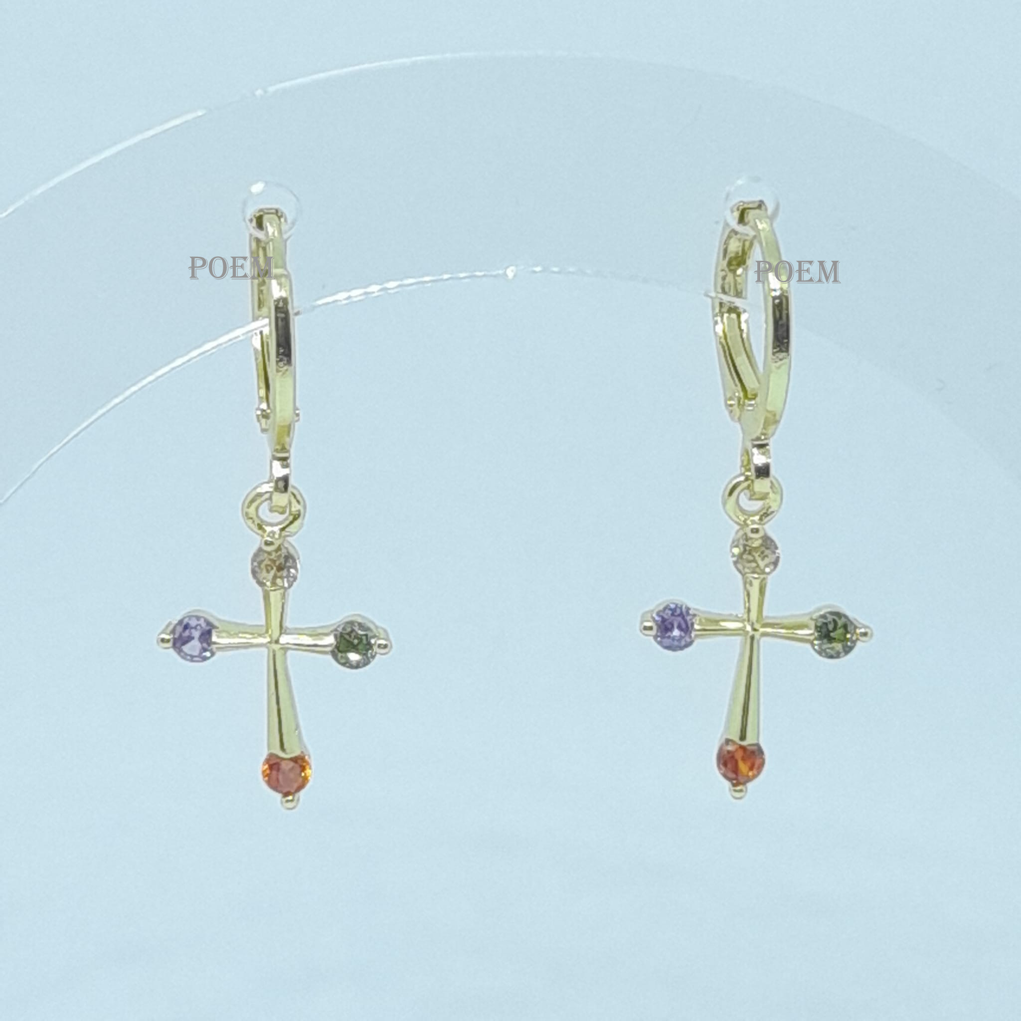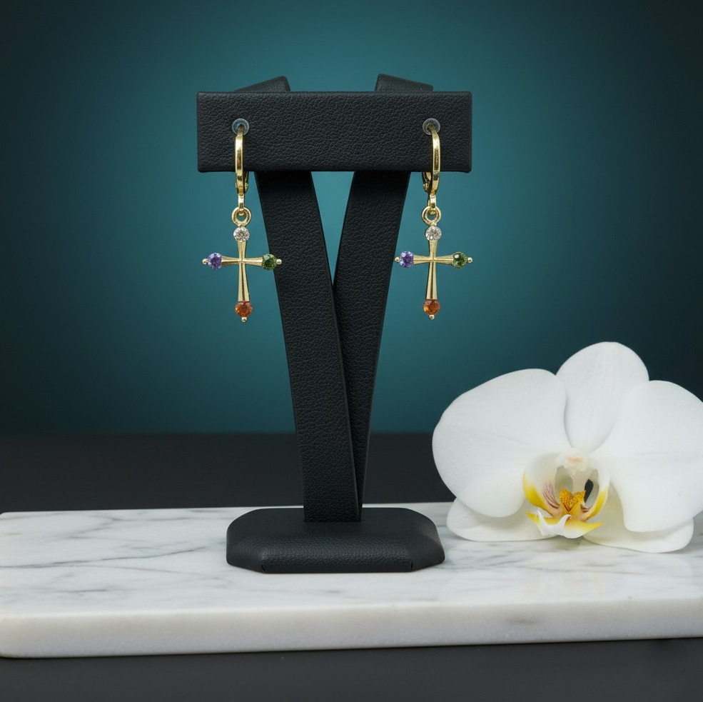 Descoperă cerceii în formă de cruce, un simbol clasic reinterpretat într-un design modern și rafinat. Cu o lungime de 3 cm, acești cercei cu tortițe sunt decorați cu micro zirconii cubice colorate, care adaugă un plus de strălucire și personalitate fiecărei ținute.