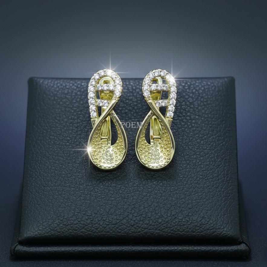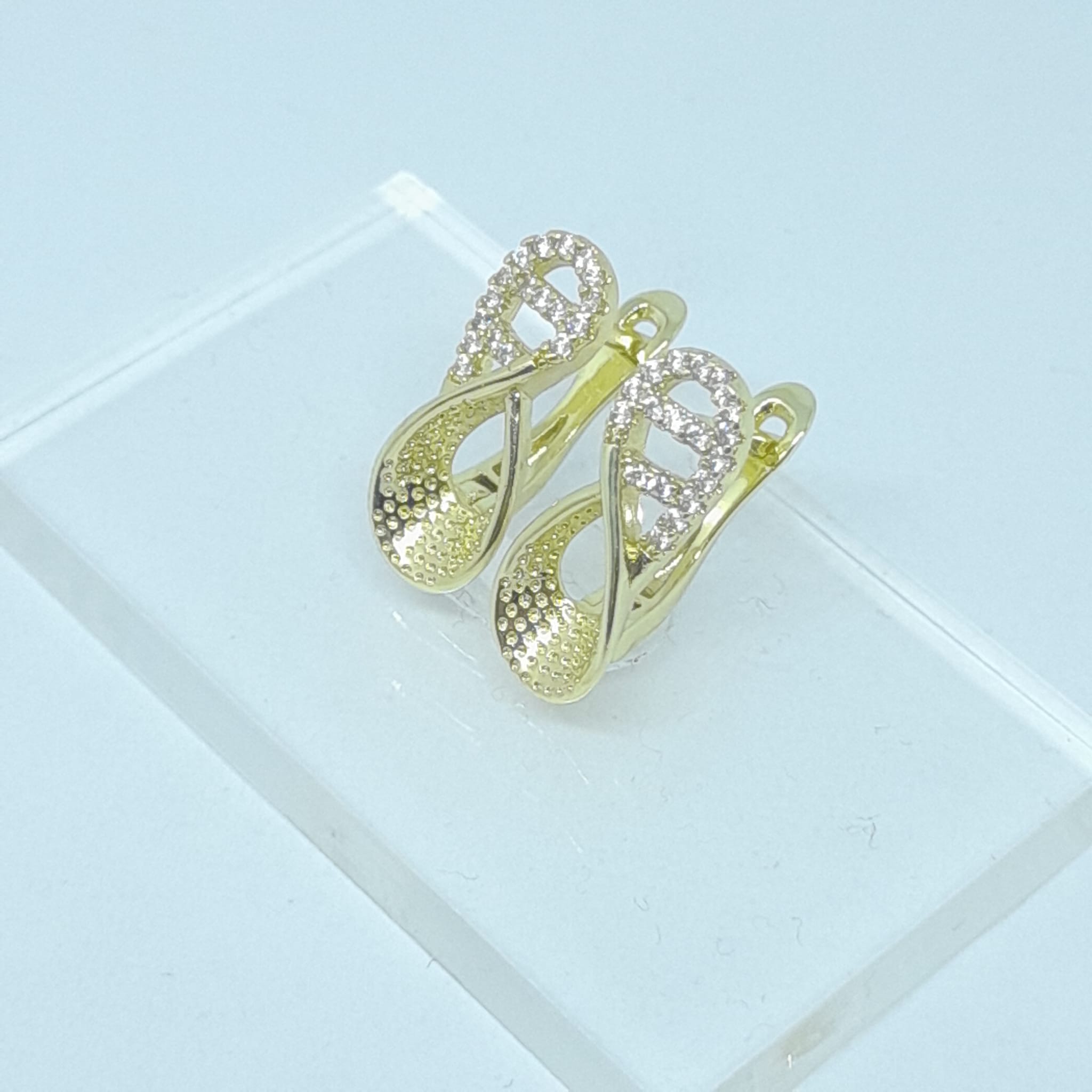 Cercei eleganți, placați cu aur de 14K, cu dimensiunea de 1,7 × 0,6 cm, decorați cu micro cristale CZ strălucitoare. Designul deosebit le oferă un aspect sofisticat și feminin, ideal pentru orice ocazie. Hipoalergenici și rezistenți la uzura zilnică, acești cercei adaugă un plus de glamour și rafinament, fiind alegerea perfectă atât pentru cadou, cât și pentru purtare zilnică.