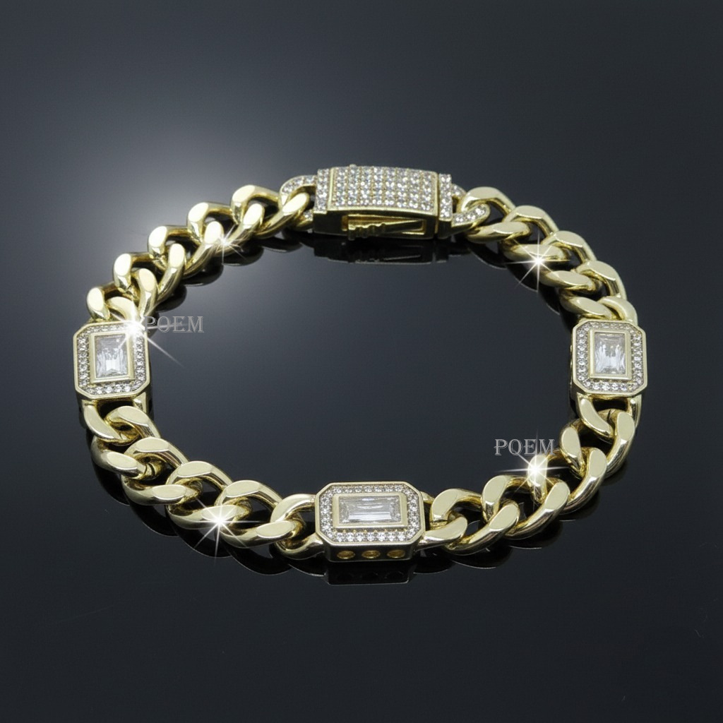 Impresionantă și sofisticată, această brățară de lux se remarcă prin designul elegant de lanț cuban, completat de inserții strălucitoare de zirconii cubice +5A cu tăietură baghetă, care oferă un plus de rafinament și strălucire. Modelul îmbină perfect stilul modern cu eleganța clasică, fiind alegerea ideală pentru persoanele care apreciază accesoriile statement.