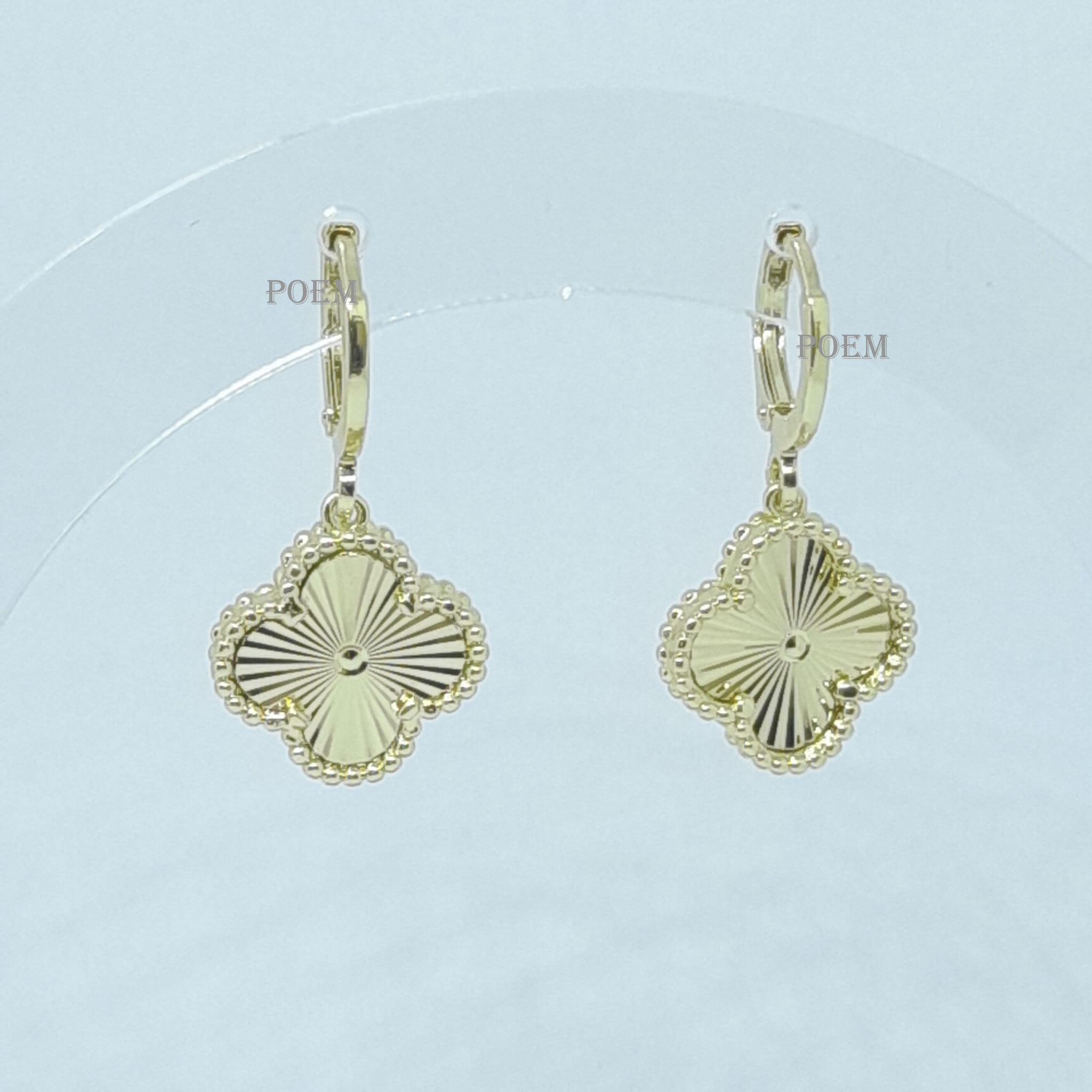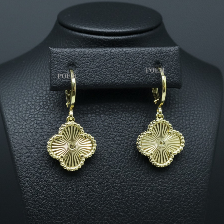 Descoperă cerceii eleganți inspirați de modelul Alhambra, cu design iconic în formă de trifoi cu patru foi, simbol al norocului, sănătății, averii și dragostei. Cu o lungime de 2.8 cm, acești cercei sunt realizați cu atenție la detalii și placați cu aur 14K, oferind un echilibru perfect între rafinament și vizibilitate.