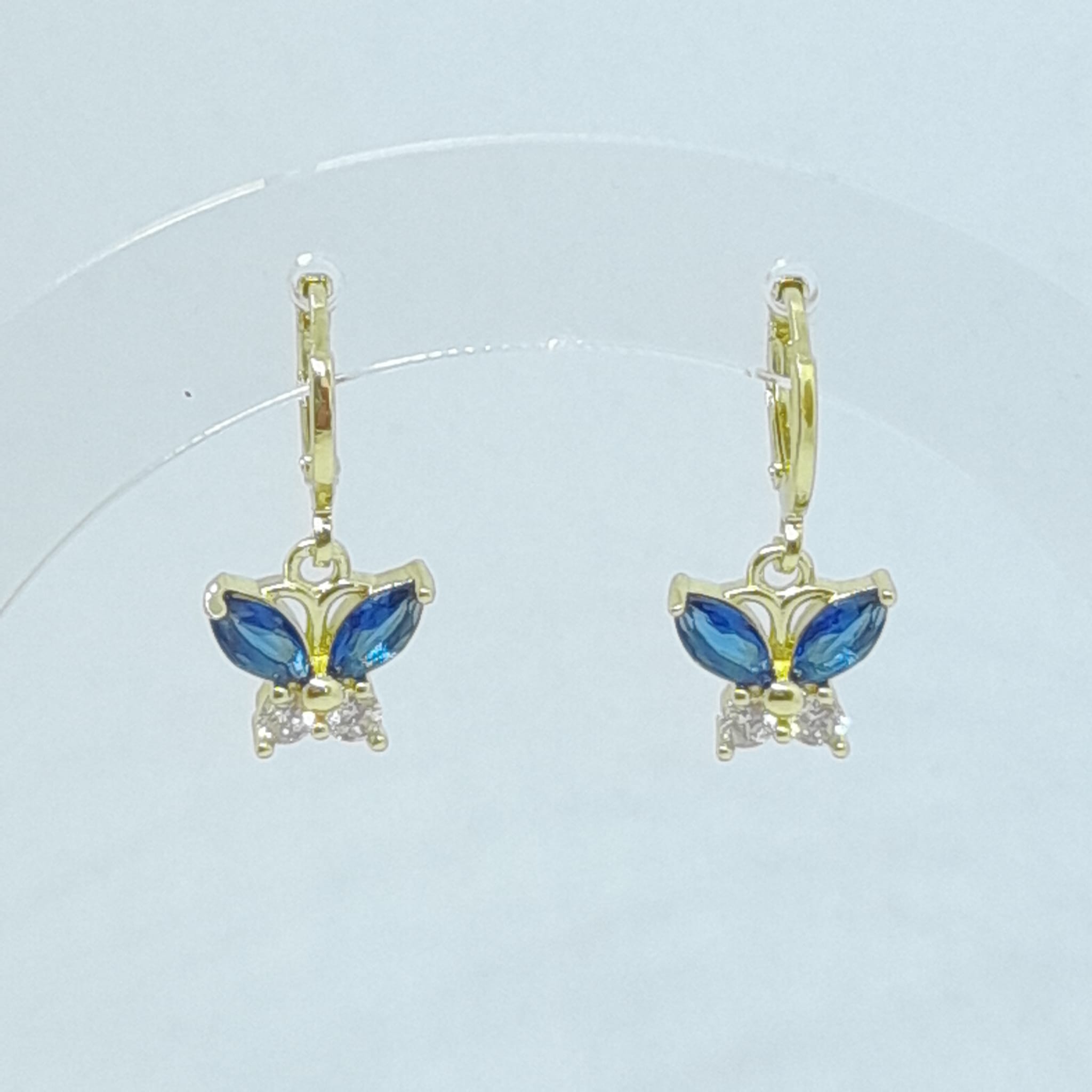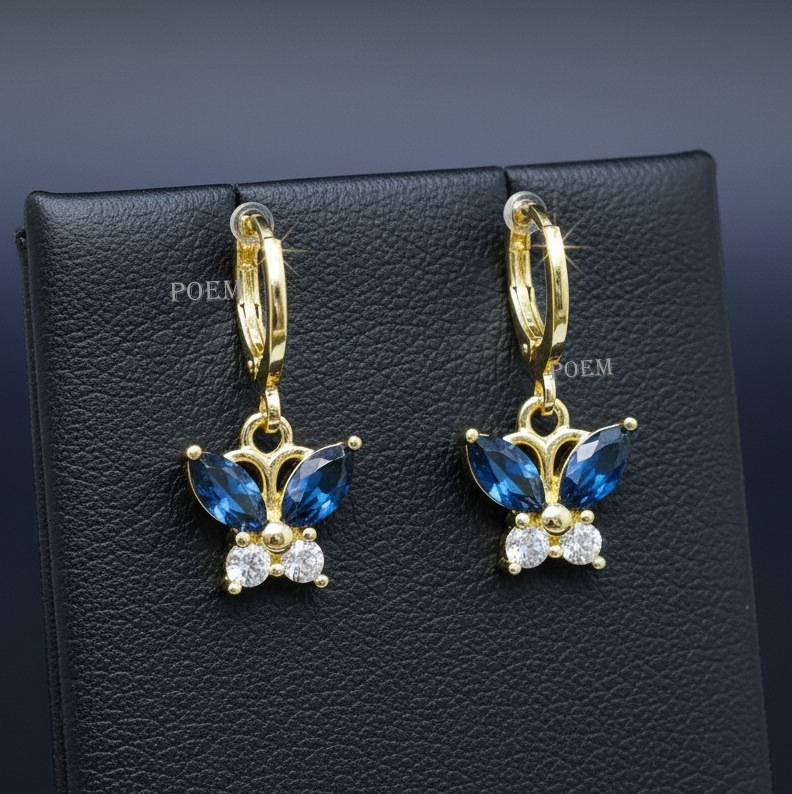 Cercei eleganți în formă de fluture, decorați cu zirconii cubice (CZ) în nuanță albastru safir, placați cu aur de 14K, cu dimensiune de 2,5 cm. Designul delicat și strălucitor oferă un efect rafinat, păstrând în același timp un aer feminin și grațios.