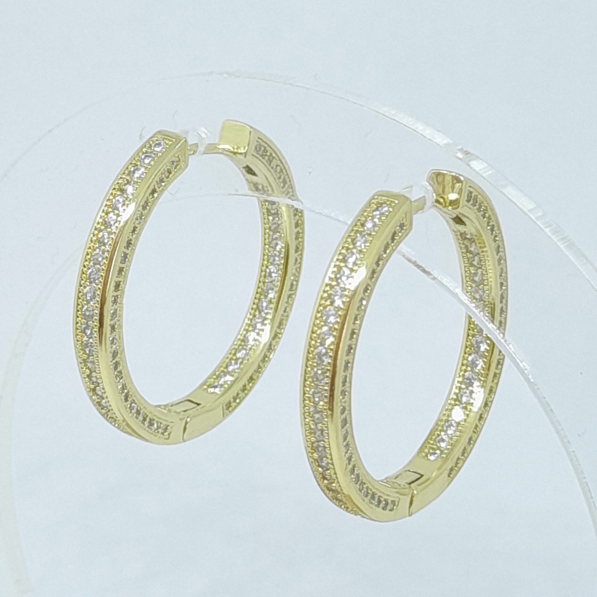 Cercei tip tortiță creole placați cu aur de 14K, cu diametrul de 3,5 cm și lățimea de 0,3 cm, decorați cu micro zirconii cubice (CZ) în montură tip pavé, creați pentru un look elegant, modern și sofisticat. Designul rafinat evidențiază linia creolelor și oferă un efect de strălucire intensă, cu finisaj premium, ideal pentru bijuterii de damă contemporane.